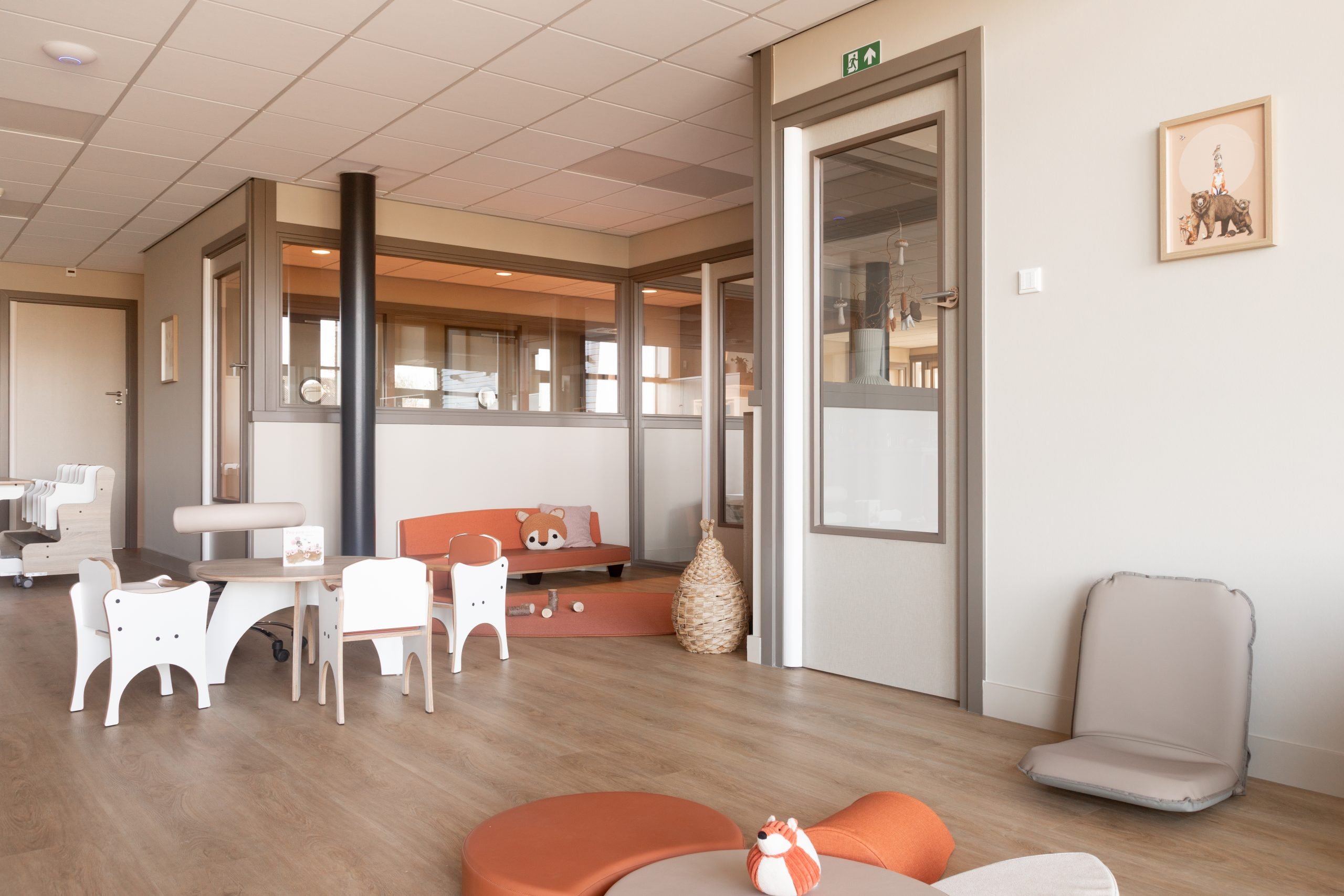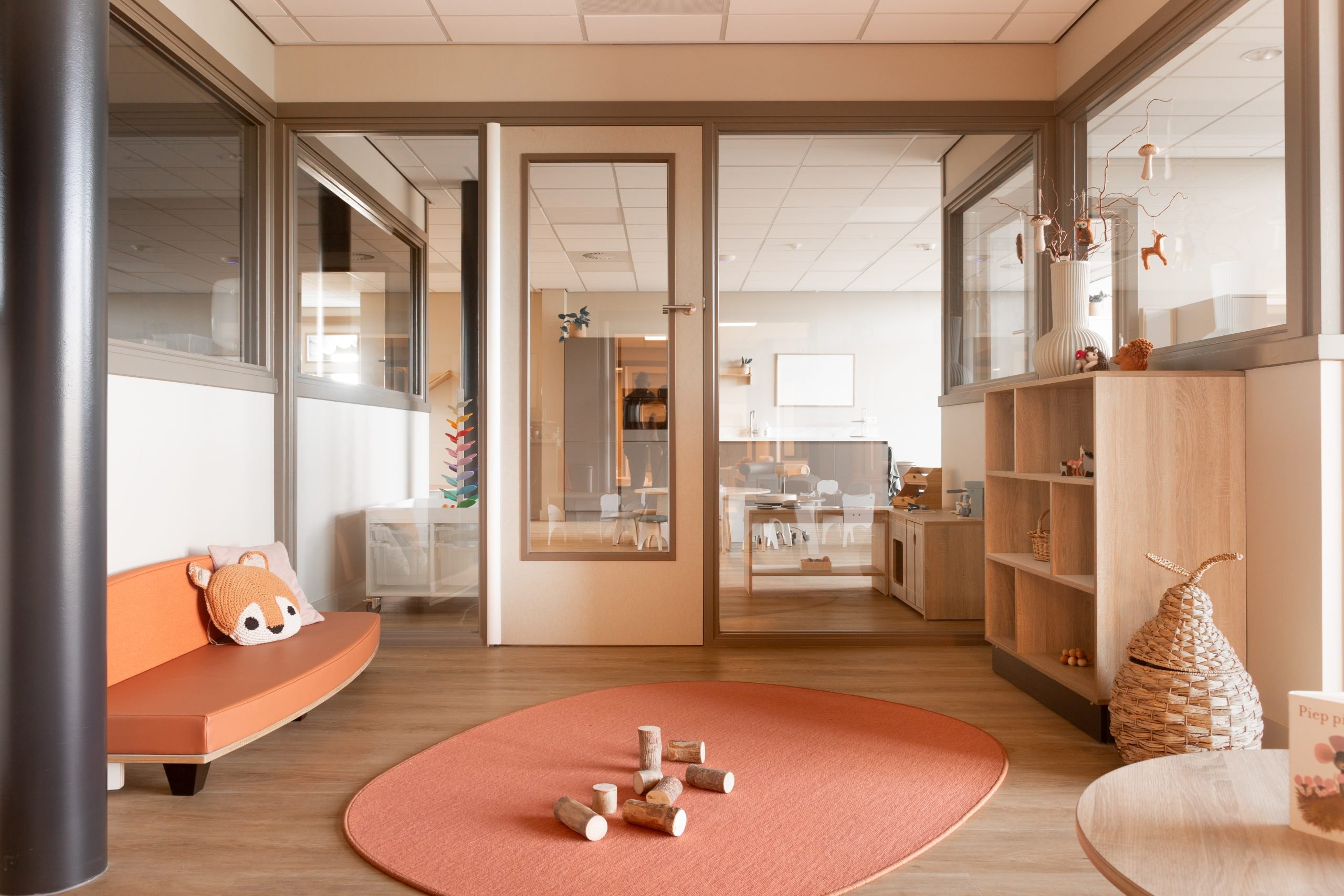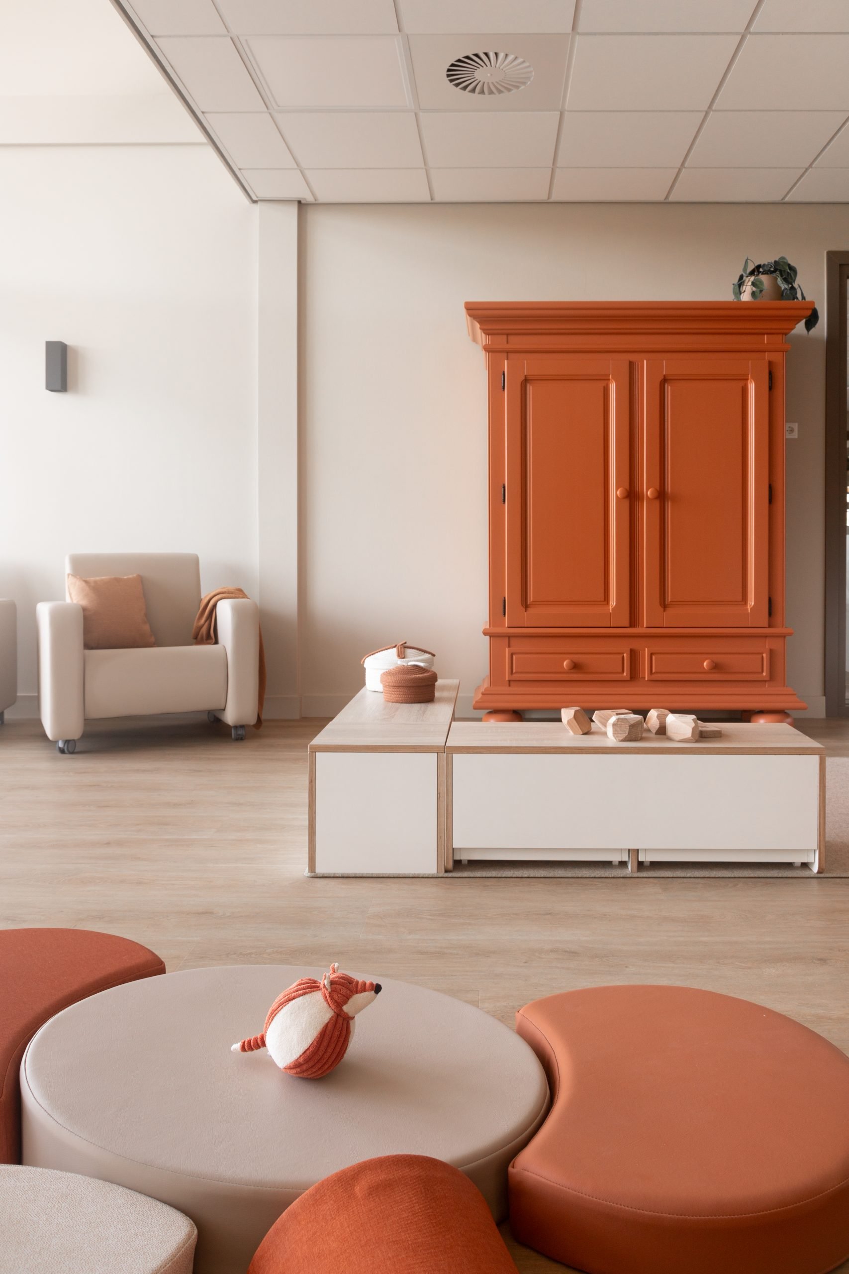 Met meubels op kindhoogte delen wij de ruimte op een logische en overzichtelijke manier in. We creëerden verschillende speelhoekjes aangevuld met rustige plekjes waar kinderen kunnen tekenen of bladeren in een boekje. Voor de allerkleinsten is een grondbox en een uitnodigend kruipeiland, waar zij op hun eigen tempo kunnen ontdekken, kruipen en ontwikkelen. De combinatie van terra, aardse tineten en warm beige geeft de ruimte een geborgen en natuurlijke uitstraling die perfect aansluit bij de boerderijsfeer en het buitenleven van Boer en Zus.