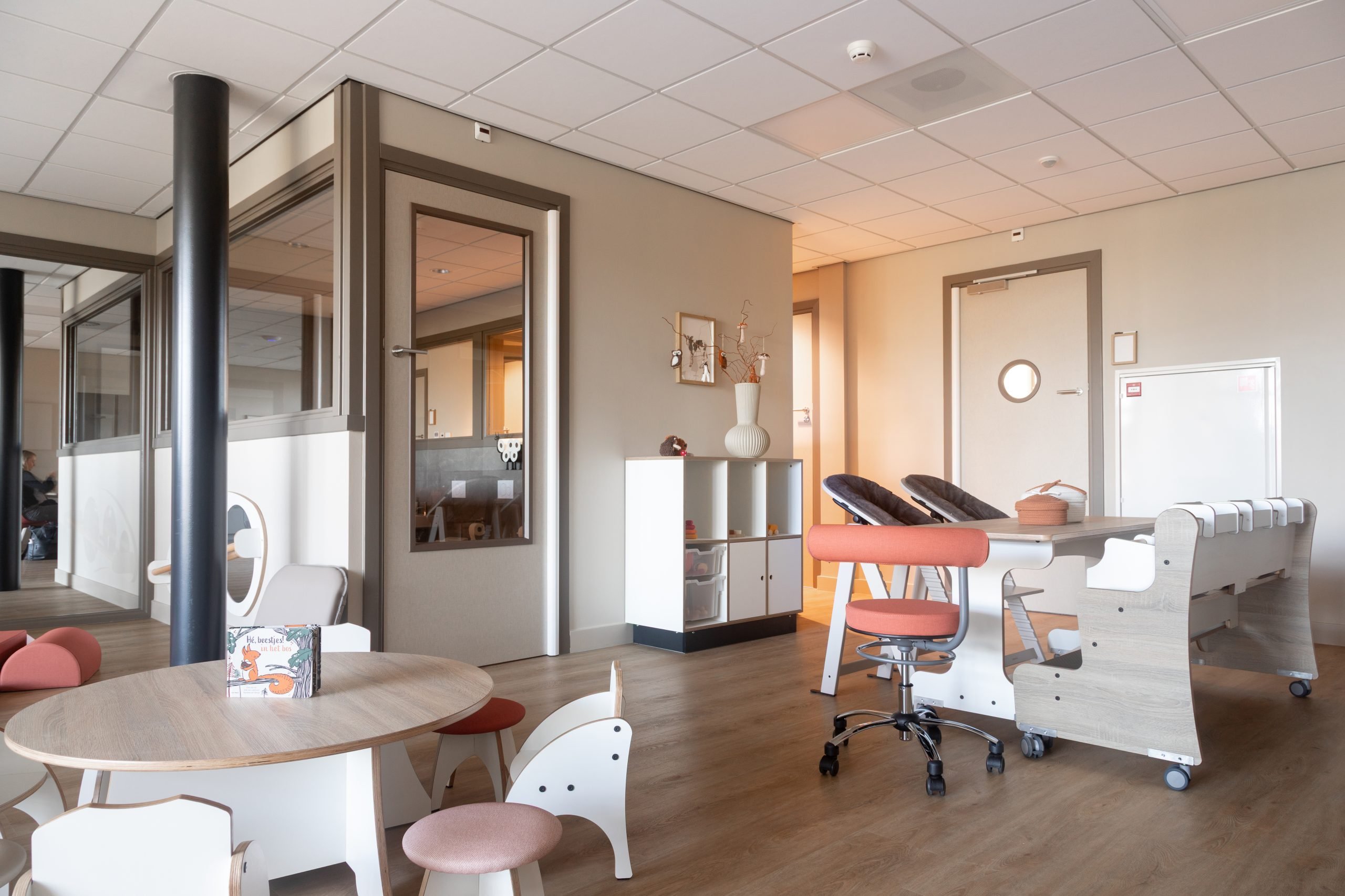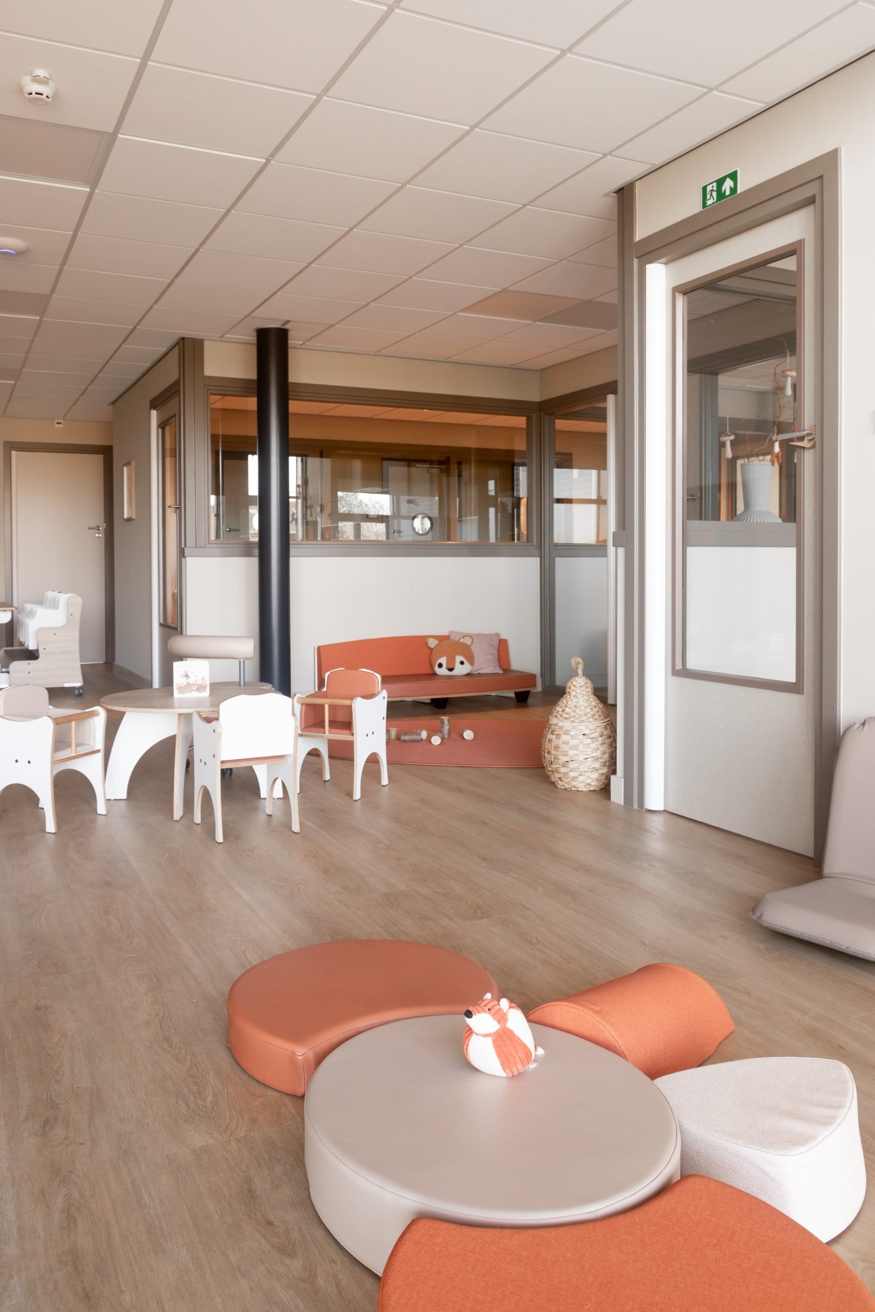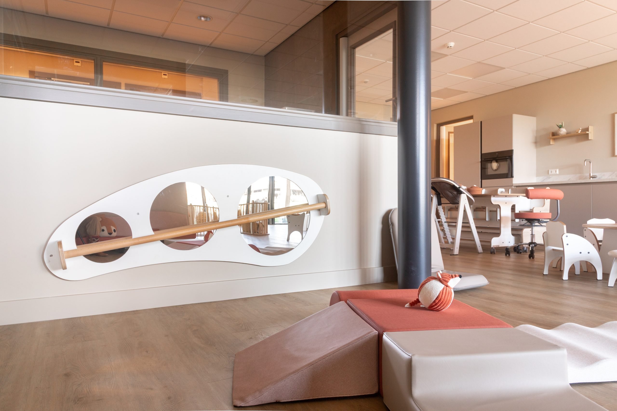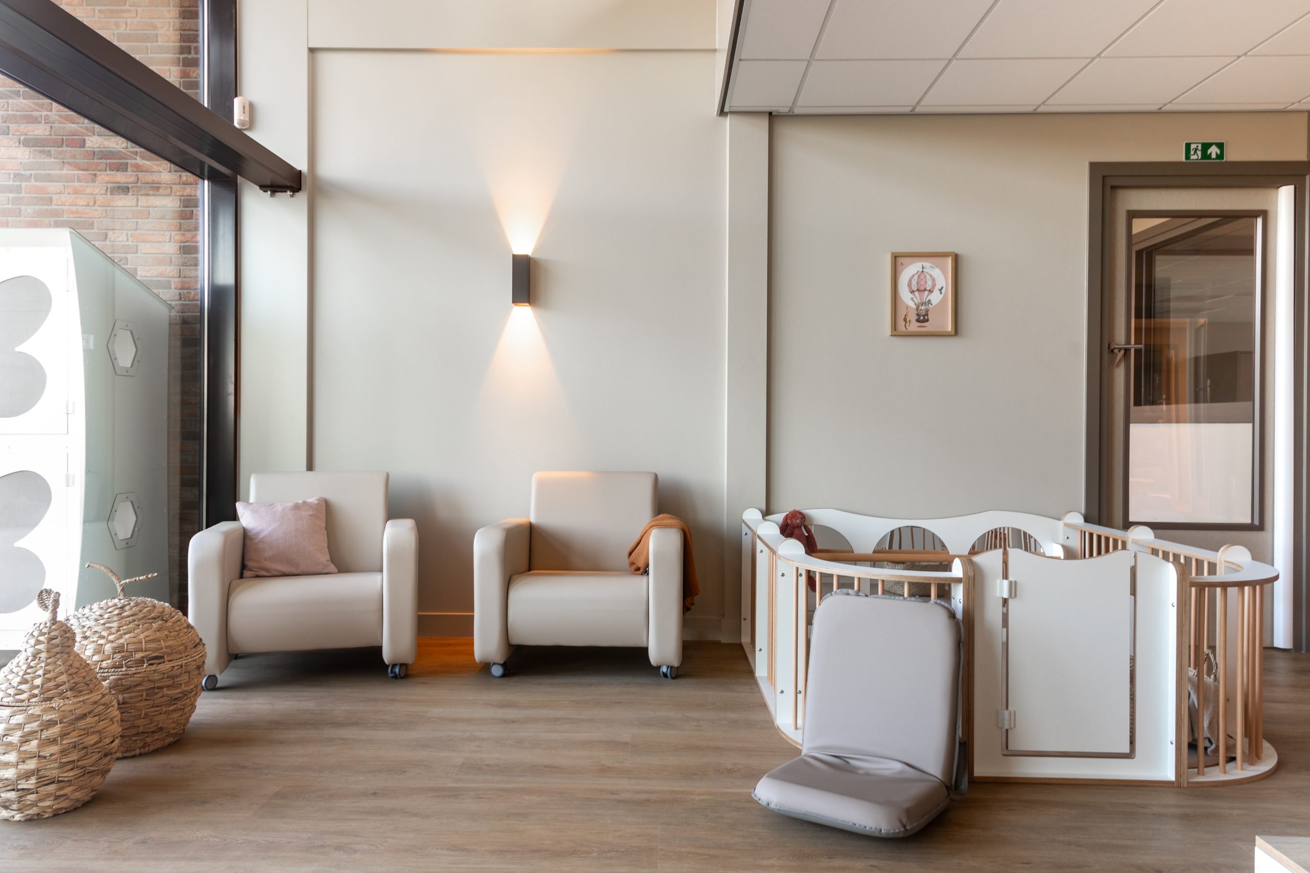 Met meubels op kindhoogte delen wij de ruimte op een logische en overzichtelijke manier in. We creëerden verschillende speelhoekjes aangevuld met rustige plekjes waar kinderen kunnen tekenen of bladeren in een boekje. Voor de allerkleinsten is een grondbox en een uitnodigend kruipeiland, waar zij op hun eigen tempo kunnen ontdekken, kruipen en ontwikkelen. De combinatie van terra, aardse tineten en warm beige geeft de ruimte een geborgen en natuurlijke uitstraling die perfect aansluit bij de boerderijsfeer en het buitenleven van Boer en Zus.